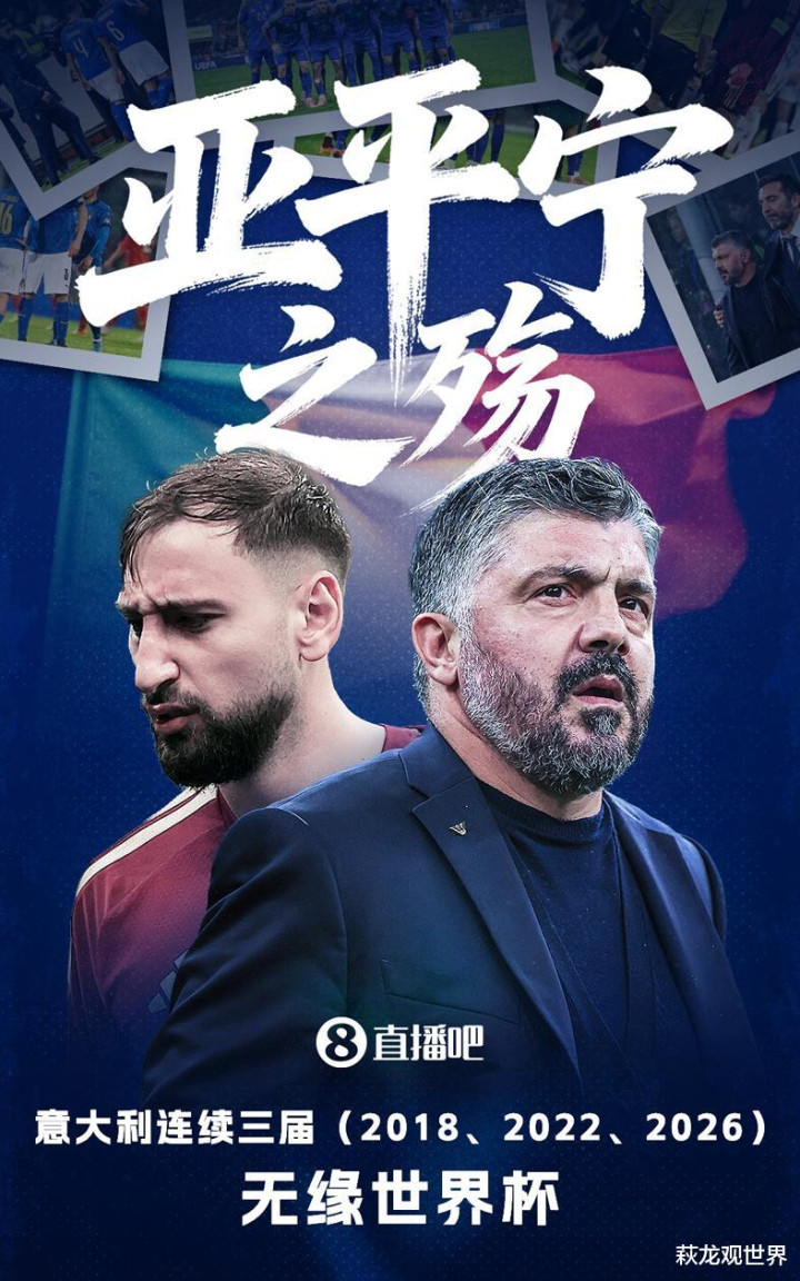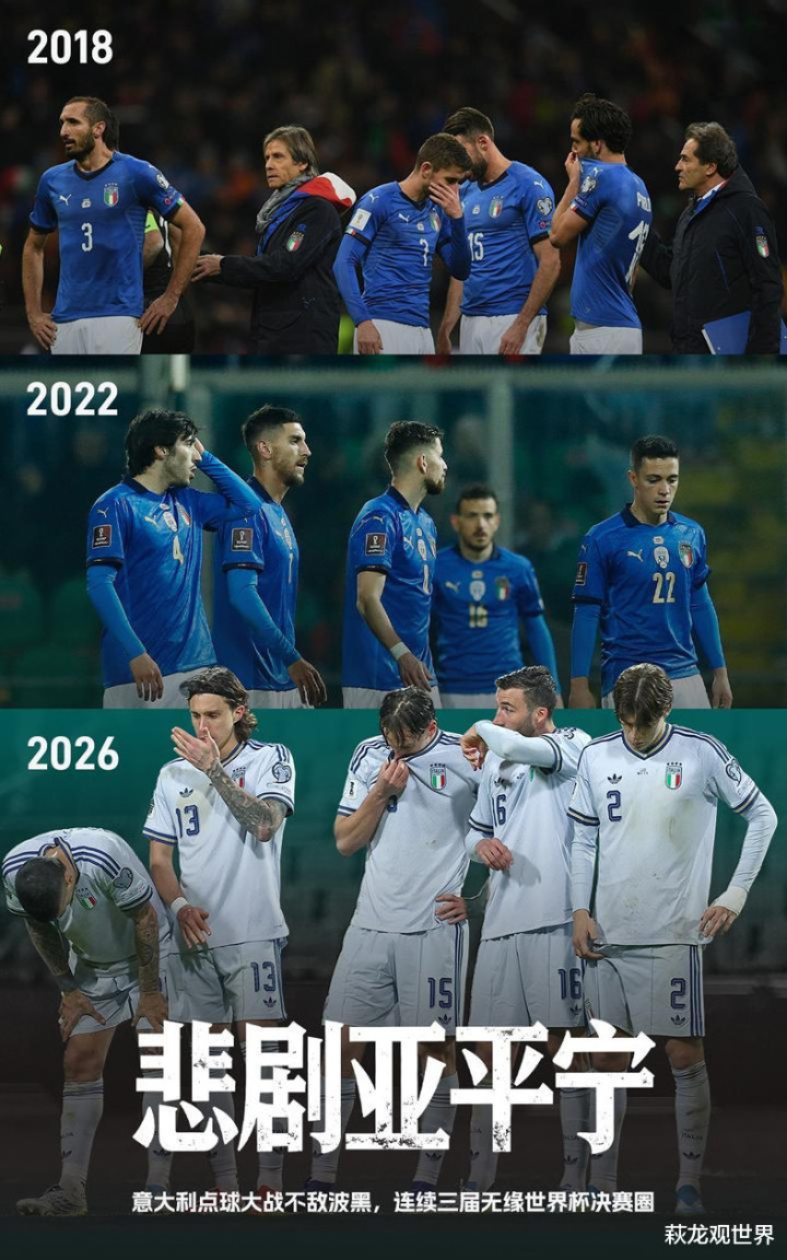 与其说意大利队还是没原谅世界杯,不如说意大利队被别人用自己最擅长的方式给淘汰了。这是命吗?如果是弱队,可以说这就是命了,比如国足在世预赛亚洲区冲击,各种受挫。中国球迷自嘲:“意大利队连续三届缺席世界杯,我们已经连续六次缺席世界杯了!”
